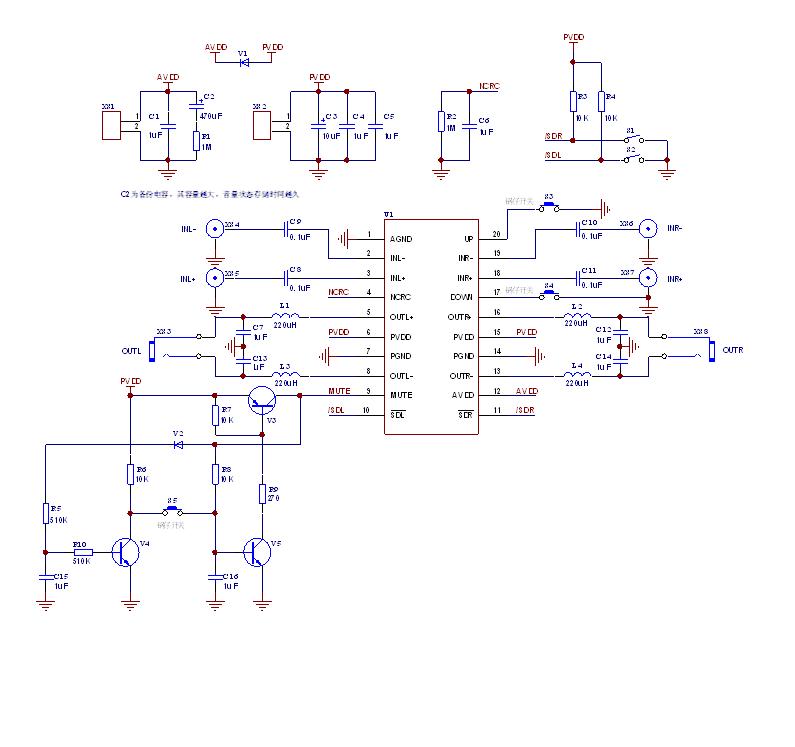 下圖為 HT6809音量控制保存恢復(fù)音量大小功能+電源開關(guān)按鍵控制原理圖