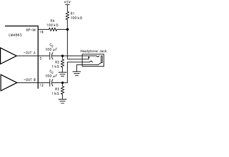 LM4863能在不使用HP-IN管腳的情況下驅(qū)動(dòng)一對(duì)橋式8Ω的揚(yáng)聲器和一對(duì)32Ω的耳機(jī)。在這種情況下,HP-IN管腳將不會(huì)連接到耳機(jī)的插孔而是連接到微處理器或是開關(guān)。通過(guò)起用HP-IN管腳,8Ω的揚(yáng)聲器能夠被關(guān)閉。
