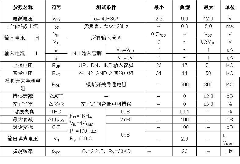 電特性(除非特別說明,VDD=9.0V,Tamb=25℃)