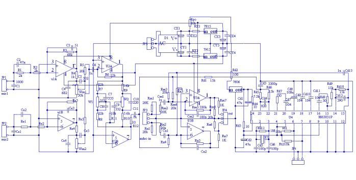 U1,U2 組成話筒的信號放大,高低音音調電路,其中MIC1,MIC2 的音量可以獨立調節(jié),由運算放大器NE5532或AD712 組成;U3 為音樂信號,話筒信號,以及由M65831 經(jīng)過數(shù)位處理輸出的延遲混音信號混合放大電路,由JP4 輸出。