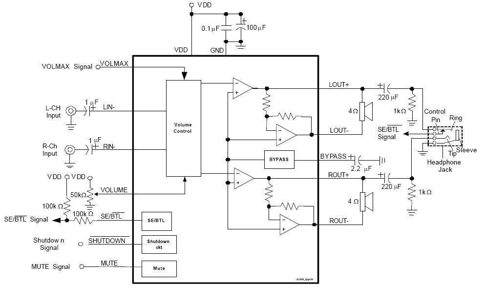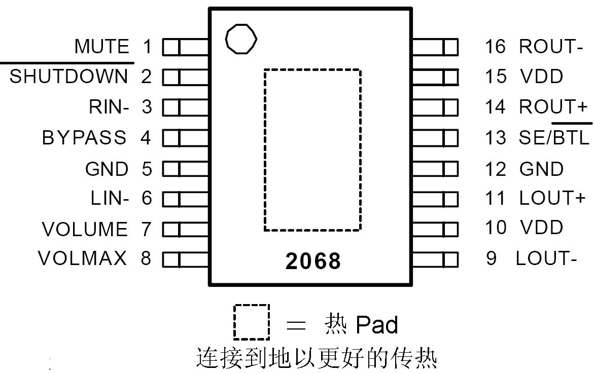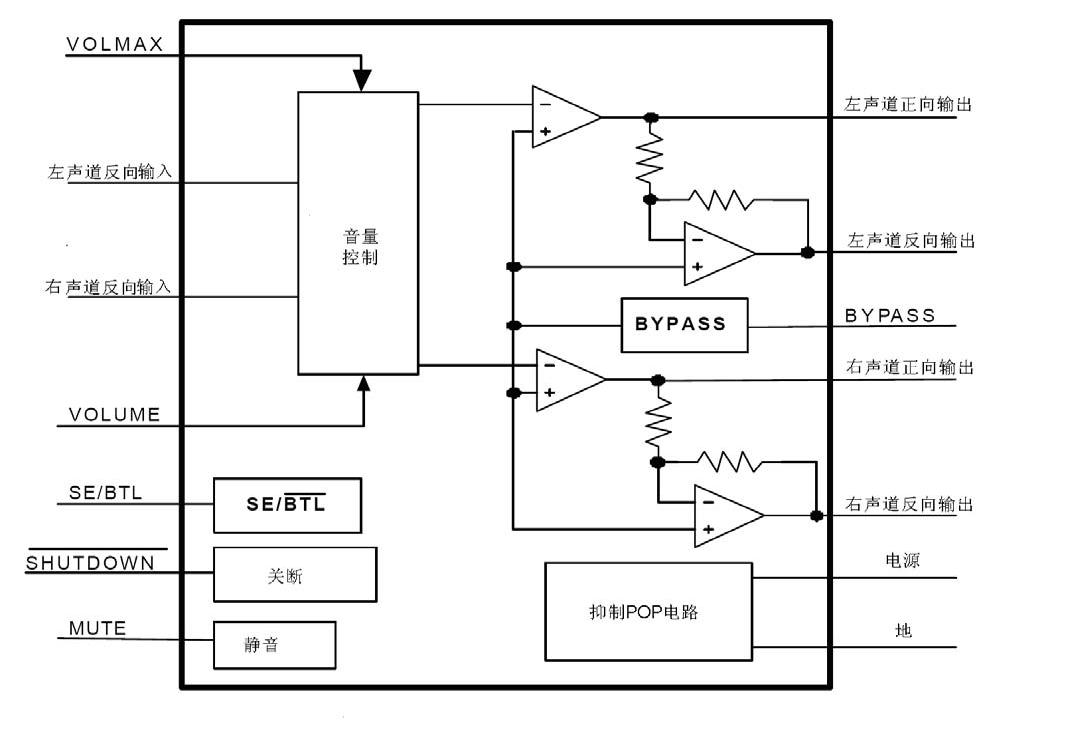 APA2068是一款能提供精確的直流音量控制的AB類(lèi)音頻功放電路。負(fù)載為4 Ω,輸出功率2.6 W(1.8 W),諧波失真10%(1%)。音量控制從20dB (DC_Vol = 0 V) 衰減到 -80dB(DC_Vol = 3.54 V) 共有32階。內(nèi)部增益設(shè)定的優(yōu)點(diǎn)在于組件更少,節(jié)省PCB區(qū)域。APA2068上集成了DEPOP電路和熱關(guān)斷保護(hù)電路。它能減小電源開(kāi)啟和關(guān)斷模式時(shí)的噪聲,抑制電源突然關(guān)閉時(shí)的瞬間噪聲,還能阻止電路因過(guò)熱和短路而損壞。為了簡(jiǎn)化音頻系統(tǒng)設(shè)計(jì),APA2068既有用于揚(yáng)聲器驅(qū)動(dòng)的BTL模式,又有用于耳機(jī)的SE模式,這些模式可以通過(guò)SE/ BTL 引腳輕松切換。