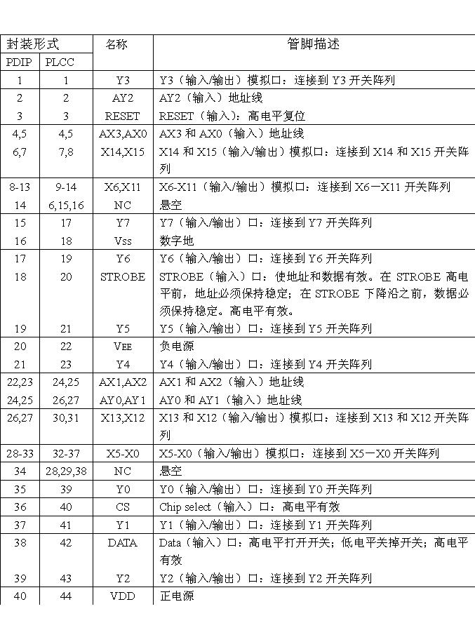 MT8816采用最先進的小工藝ISO-CMOS制造工藝,功耗低,可靠性高,隔離度好。該電路包含8×16個模擬開關(guān)陣列,7到128個地址譯碼和鎖存電路。通過不同的地址信號,可以對128個開關(guān)尋址。DATA端口輸入邏輯電平“1”或“0”,可對模擬開關(guān)打開或關(guān)閉。模擬信號范圍從VDD到VEE。還可以通過芯片CS,允許對芯片開關(guān)陣列擴展。采用PLCC-44/DIP-40封裝。CD22M3494/M3494/AT8816與其管教兼容。