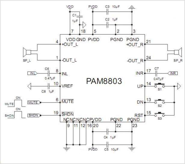 PAM8803是一款帶64級(jí)電子音量控制的3 W 立體聲D 類音頻功率放大器,能夠以D 類放大器的效率提供AB 類功率放大器的性能。采用D 類結(jié)構(gòu),PAM8803能夠以高于90 %的效率提供3 W功率。新型的無(wú)濾波器結(jié)構(gòu)可以省去傳統(tǒng)的D類放大器輸出低通濾波器,從而節(jié)省了系統(tǒng)成本和PCB 空間,是便攜式應(yīng)用的理想選擇。PAM8803工作電壓2.5V-5.5V,采用SSOP-24 封裝。市場(chǎng)上TA8803與其管教兼容。