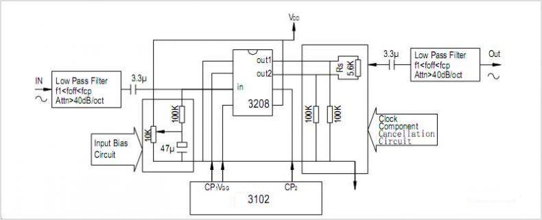 MN3208集成塊通常與其配套的時(shí)鐘信號(hào)驅(qū)動(dòng)器(又稱(chēng)時(shí)鐘信號(hào)發(fā)生器)MN3102在一起使用,為BBD器件提供時(shí)鐘信號(hào),兩者共同完成信號(hào)的延遲。其集成塊的典型應(yīng)用電路見(jiàn)圖。