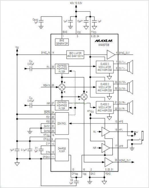 內(nèi)部有源濾波器處理立體聲輸入(左聲道和右聲道),送至立體聲高通和單聲道低通輸出。交叉開關(guān)頻率由引腳選擇為4個不同頻率,以適應(yīng)多種揚(yáng)聲器配置。內(nèi)置D類放大器具有低EMI擴(kuò)頻輸出。無需輸出濾波器。
