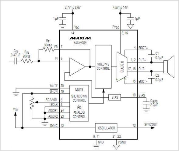MAX9768具有64級雙模(模擬或數(shù)字可編程)音量控制和靜音功能。該音頻放大器工作于4.5V至14V單電源,采用14V電源供電時,可向8Ω揚聲器提供高達10W的輸出功率。