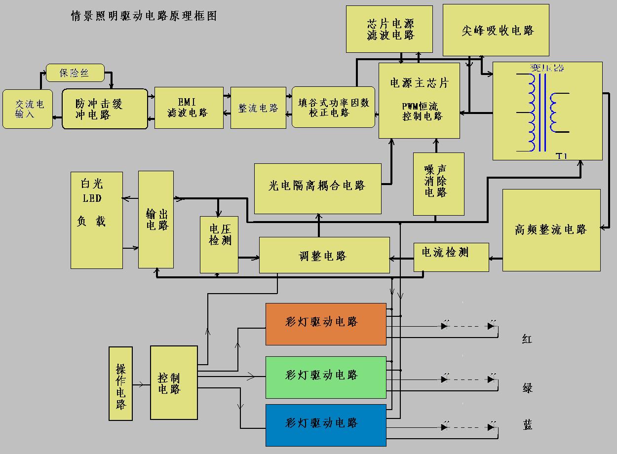 情景照明LED驅(qū)動(dòng)線路的原理框圖:
