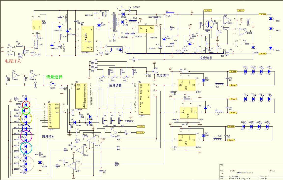 簡述一下情景照明LED驅(qū)動(dòng)線路主電源電路的設(shè)計(jì)思路,電路如上圖。主電源電路輸出分為兩路: