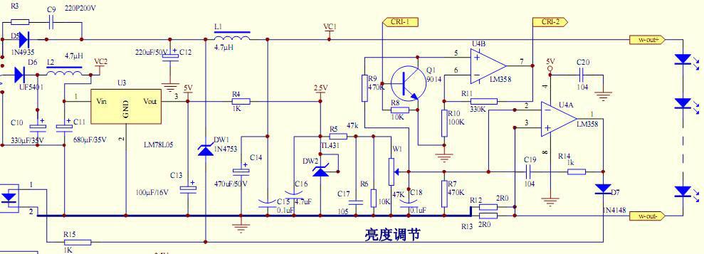 一路輸出為VC1,用于白光LED驅(qū)動(dòng),電阻R12、R13為白光LED電流檢測電阻,電位器W1是亮度調(diào)節(jié)電位器,可調(diào)節(jié)預(yù)置一定的電壓,運(yùn)放U4a用于比較電位器W1電壓和電阻R12、R13的電壓,其輸出通過光耦反饋來調(diào)節(jié)輸出電流的大小,亦即調(diào)節(jié)白光LED的亮度。DW1用于電路輸出電壓控制,防止LED負(fù)載或電位器為W1開路而使驅(qū)動(dòng)電路輸出高電壓,Q1和U4B是用于跟蹤電位器W1電壓變化而相應(yīng)輸出電壓變化的可控的電路,其輸出電壓用于控制彩色LED的功率輸出,目的是提高LED燈具出光顯色性指數(shù),補(bǔ)償單白光LED顯色性指數(shù)偏低的缺陷;