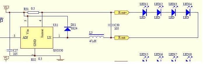 彩燈驅(qū)動(dòng)電路采用SN3350,應(yīng)用其推薦典型電路,增加C30,減小輸出電流紋波,提高發(fā)光穩(wěn)定度。亮度控制采用直流電壓調(diào)整方式,電路相對簡單,無噪聲,出光無閃爍。