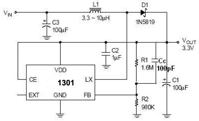 1.5V(單節(jié)堿性干電池)DC/DC升壓至3.3V,100mA輸出電流(PT1301/AX1301典型MP3應用)
