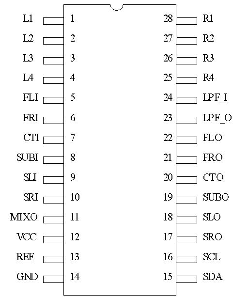 混音聲道意指CT (中央聲道)和SUB(副低頻聲道),這兩個(gè)聲道的信號(hào)是由L,R信號(hào)相加混音而成。原本L,R信號(hào)并未加以處理直通FL,FR輸出端,因仍含有完整的同相信號(hào)(CT)與副低頻信號(hào)(SUB),因此混音聲道為-6dB輸出,以免幅值過大。此混音(-6dB)輸出可以用I2C介面控制其開啟。