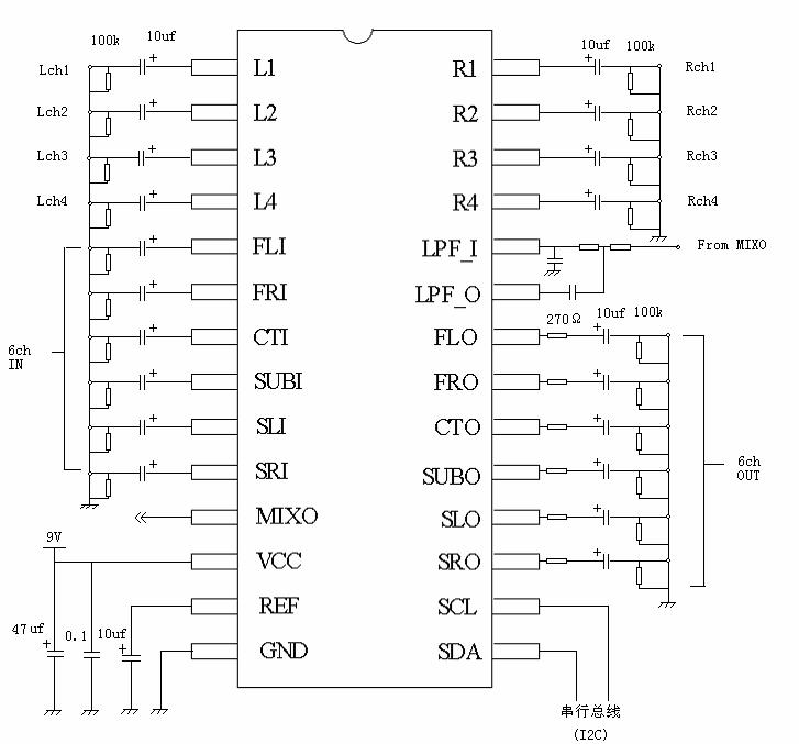 PT2323的任一組立體聲輸入端被選擇均直接被自動(dòng)轉(zhuǎn)成6聲道輸出,但是6聲道輸出端的信號(hào)被選擇時(shí),則是直通6聲道的輸出端,信號(hào)不經(jīng)過任何處理。2-6轉(zhuǎn)換時(shí),原來的L和R音源也是直通輸出端,只有CT,SUB,SL,SR為經(jīng)過處理而附加的。但并非任何立體聲信號(hào)均有必要轉(zhuǎn)換成6聲道輸出,因此PT2323提供了每聲道獨(dú)立的靜音功能,不需要輸出的聲道均可以用靜音功能在輸出端予以控制。