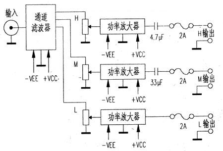 為了改變這種情況,產(chǎn)生了多通道放大器方式。在前置放大器之后用有源濾波器分割頻帶,各頻段有自己的功率放大器和揚(yáng)聲器,各頻段的電平在各功率放大器之前用電位器調(diào)整。這種方式的優(yōu)點(diǎn)是顯而易見的,它取消了前述LC網(wǎng)絡(luò),又能有效地利用各個(gè)揚(yáng)聲器的效率;同時(shí),也降低了對(duì)功率放大器的頻率要求,輸出功率也可以小一些;這種結(jié)構(gòu)示于圖1。其關(guān)鍵電路是有源濾波器。