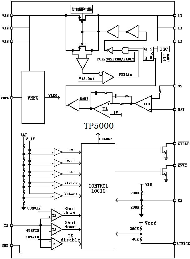TP5000是專門為單節(jié)4.2V鋰離子/3.6V磷酸鐵鋰電池而設(shè)計的開關(guān)型大電流充電器芯片,利用芯片內(nèi)部的功率晶體管對電池進(jìn)行涓流、恒流和恒壓充電。充電電流可以用外部電阻編程設(shè)定,最大持續(xù)充電電流可達(dá)2A,不需要另加防倒灌二極管。TP5000包含兩個漏極開路輸出的狀態(tài)指示輸出端,充電狀態(tài)指示端CHRG和電池充滿狀態(tài)指示輸出端STDBY。芯片內(nèi)部的功率管理電路在芯片的結(jié)溫超過145℃時自動降低充電電流,這個功能可以使用戶最大限度的利用芯片的功率處理能力,不用擔(dān)心芯片過熱而損壞芯片或者外部元器件。 當(dāng)輸入電壓大于芯片啟動閾值電壓和芯片使能輸入端接高電平或者懸空時,TP5000開始對電池充電,CHRG管腳輸出低電平,表示充電正在進(jìn)行。如果鋰離子電池電壓低于2.9V(磷酸鐵鋰電池電壓低于2.5V),充電器用小電流對電池進(jìn)行涓流預(yù)充電(預(yù)充電電流通過外接電阻可調(diào))。恒流充電電流由VS管腳和VBAT管腳之間的電阻確定。當(dāng)鋰離子電池電壓接近4.2V(磷酸鐵鋰電池接近3.6V)時,距離充電截止電壓約50mV(根據(jù)不同的電路連接電阻與電池內(nèi)阻電壓不同),充電電流逐漸減小,TP5000進(jìn)入恒壓充電模式。當(dāng)充電電流減小到截止電流時,充電周期結(jié)束,CHRG端輸出高阻態(tài),STDBY端輸出低電位。 當(dāng)電池電壓降到再充電閾值(鋰離子電池4.05V,磷酸鐵鋰電池3.45V)時,自動開始新的充電周期。芯片內(nèi)部的高精度的電壓基準(zhǔn)源,誤差放大器和電阻分壓網(wǎng)絡(luò)確保電池端截止電壓的精度在+-1%以內(nèi),滿足了鋰離子電池和磷酸鐵鋰電池的充電要求。當(dāng)輸入電壓掉電或輸入電壓低于電池電壓時,充電器進(jìn)入低功耗的停機模式,無需外接防倒灌二極管,電池從芯片的漏電接近4uA。