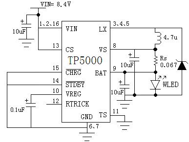 圖5為TP5000為兩接鋰電驅(qū)動5W WLED應(yīng)用示意圖(RTRICK引腳懸空)