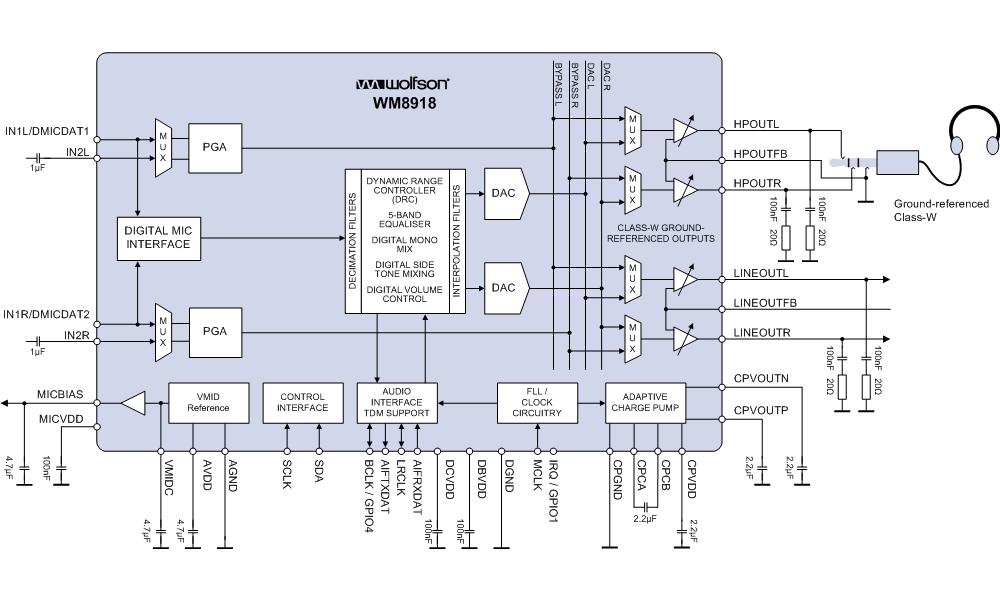 WM8918以立體聲接地參考耳機放大器為特色,它采用了歐勝W類放大器和一個創(chuàng)新的雙模電荷泵架構來改善回放期間的效能和功耗,通過去除了對交流耦合電容器的需求來減少電路板的面積、原料成本以及改善低音響應。
