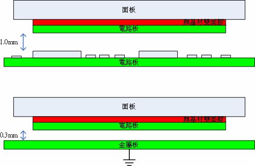 c.由於感應(yīng)電極與面板接觸點之間不能有空隙,所以機構(gòu)設(shè)計上必須考慮將感應(yīng)驗路板直接黏貼在外殼面板的內(nèi)側(cè),以及考慮面板的組裝方式。