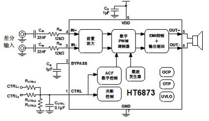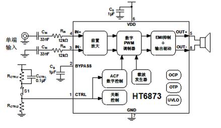 HT6873內(nèi)部集成免濾波器數(shù)字調(diào)制技術(shù),能夠直接驅(qū)動(dòng)揚(yáng)聲器,并最大程度減小脈沖輸出信號(hào)的失真和噪音。輸出無(wú)需濾波網(wǎng)絡(luò),極少的外部元器件節(jié)省了系統(tǒng)空間和成本,是便攜式應(yīng)用的理想選擇。