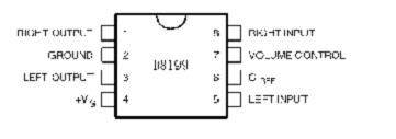 D8199 是一塊立體聲放大直流音量控制電路。廣泛應(yīng)用于音頻放大器遠程控制、電子游戲機和CATV(光纖電視)音頻的控制。   采用DIP8的封裝形式。管教兼容TDA8199 。