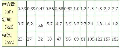 當將不同容量的電容器C(如圖1所示),接入AC220V 50Hz的交流電路時,其C的容抗及其所能通過的電流如附表所列。該電流即電容器C所能提供的最大電流值。