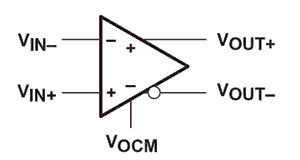 差分放大器就是接受和輸出差分信號(hào)的器件,同運(yùn)算放大器一樣,它能接收雙端輸入,不同的是它具有雙輸出端,而不像運(yùn)算放大器只有單端口。在差分放大器中,其輸出共模電壓(VOCM)能獨(dú)立地被差分電壓控制。圖1是差分放大器的簡(jiǎn)明原理圖。