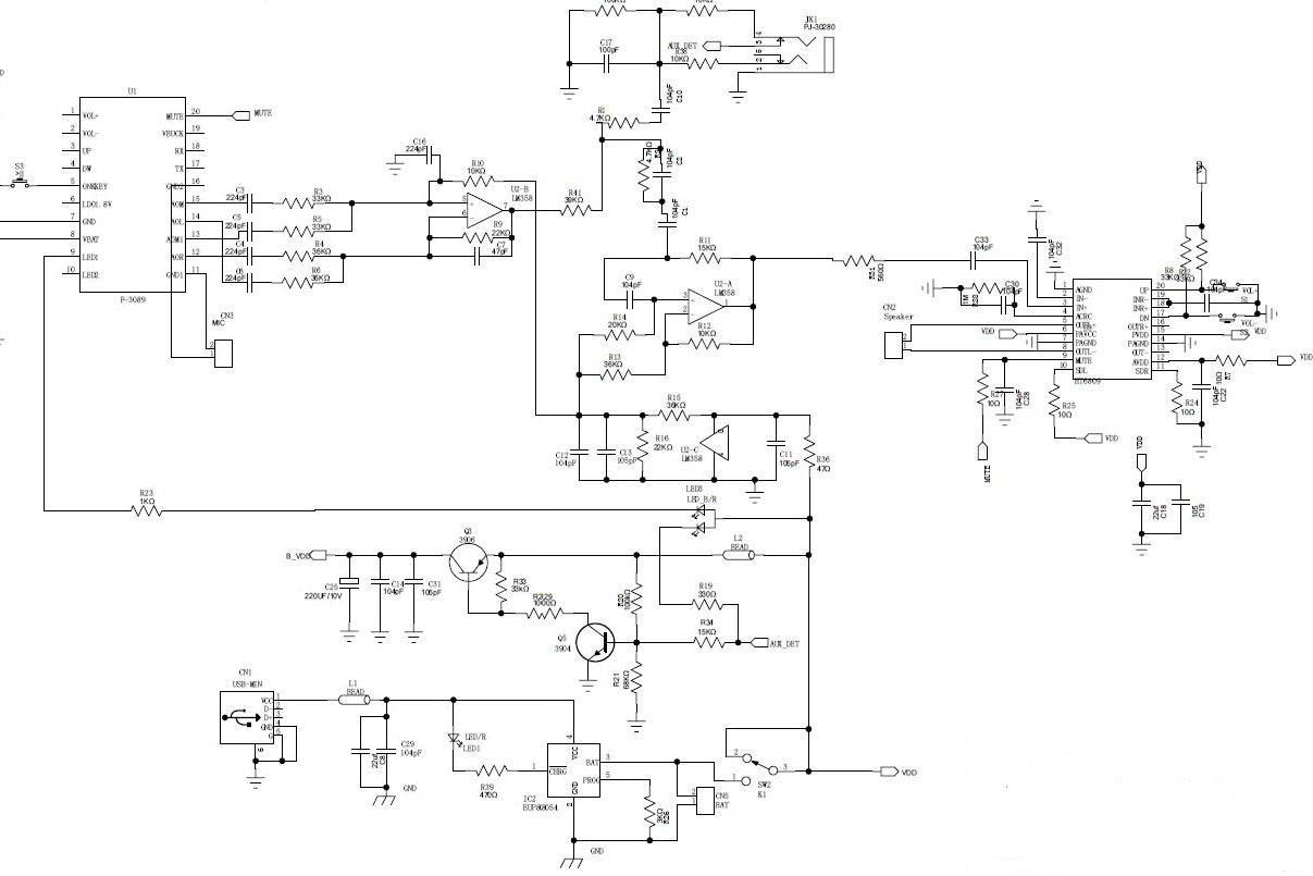 上圖為比較典型藍(lán)牙小音箱設(shè)計(jì)原理圖,其主要器件為: