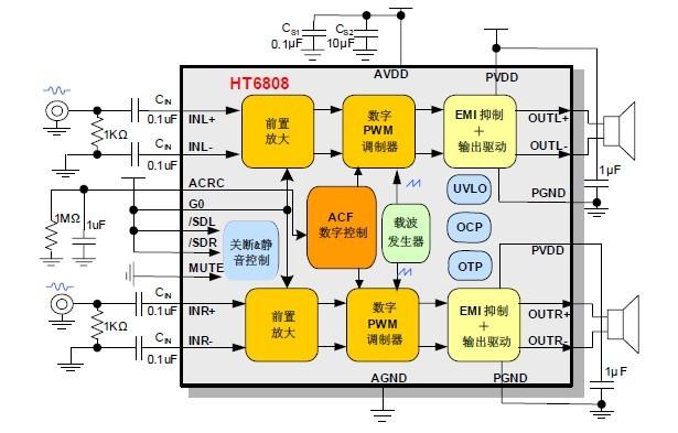 HT6808(防破音功能的3W雙聲道、6W單聲道D類功放IC)