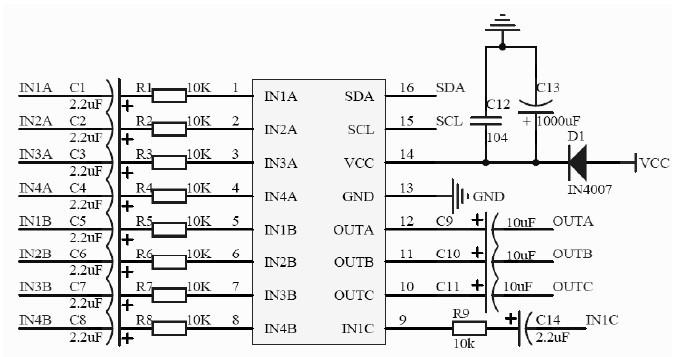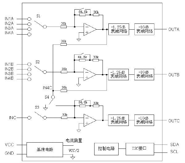 AIP1115工作電壓范圍為3V到9V,含四路立體聲輸入選擇器,還包含一個(gè)混音器,可以由2聲道立體聲輸入混音合成為2.1聲道輸出。它的音量調(diào)節(jié)部分包含一個(gè)0/10dB的前級(jí)放大器和一個(gè)0~-77.5dB,每級(jí)-1.25dB的音量控制器。它還具有靜音功能,具有低失真、低噪聲的特點(diǎn)。