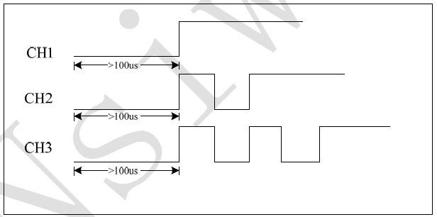 機(jī)器工作過程中,通道切換時(shí),先拉低CTRL管腳100us以上讓芯片進(jìn)入關(guān)斷(SHUTDOWN)狀態(tài)然后重新設(shè)置。示意圖如下: