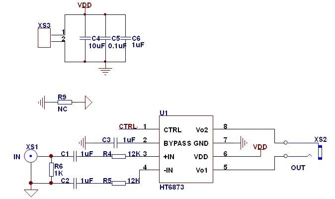2: LM4871管腳三(同相輸入端)是接1UF電容到地,HT6873的同相輸入端(INP)要接與INN匹配的輸入電阻、電容,構(gòu)成差分輸入,如圖4所示。