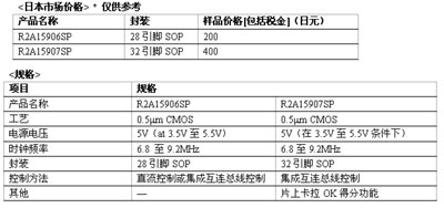 瑞薩科技公司(Renesas Technology Corp.)兩款用于卡拉OK機(jī)、DVD播放機(jī)和類似視聽設(shè)備的單芯片卡拉OK回波IC:具有兩倍于瑞薩科技以前產(chǎn)品的44Kb回波RAM*1容量的R2A15906SP,以及包括了得分功能的R2A15907SP。