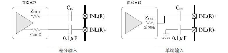 對(duì)于單端信號(hào)輸入時(shí),通過隔直電容將信號(hào)輸入到INL+端。同時(shí),INL-端必須通過一個(gè)電容CREF (與CIN相同的值)到地,見圖2。右聲道輸入情況同
