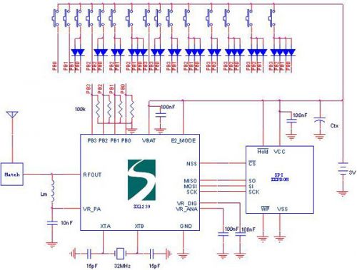 PB(3:0)是按鍵接口,如果使用二極管編碼電路,最多可以支持15個按鍵。平時SX1230處于睡眠狀態(tài),按鍵動作將喚醒芯片并進行去抖,然后發(fā)送該按鍵對應的RF數(shù)據(jù)包,完成后再回到睡眠狀態(tài)。
