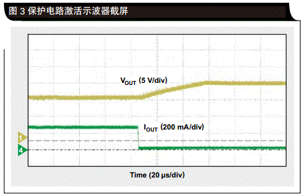 為了測試保護電路的運行情況,我們使用一個38Ω的電阻器十進位箱代替LED串,目的是模擬設計負載電流下LED串的電壓。通過快速地將負載電阻從38Ω改變?yōu)?038Ω,可以模擬一次開路故障。如圖3所示,這種輸出電流變化(綠色線條)表明了負載阻抗的突然變化。為了進行補償,TPS61170輸出電壓(黃色線條)上升,以重新達到設計負載電流。但是,這種變化不會始終如此,直到達到其最大占空比,輸出電壓穩(wěn)定在了約16V的箝位電壓。