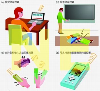 而且,在使用RF的情況下,將有可能在短距離內(nèi)實現(xiàn)遠優(yōu)于紅外線性能的高速數(shù)據(jù)通信。把數(shù)據(jù)廣播的內(nèi)容發(fā)送到遙控器中的應(yīng)用也在考慮之中。或者,如果是集成了藍牙功能的手機,也可以利用藍牙無線功能,將手機當(dāng)作遙控器使用。