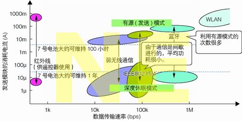 在藍牙2.1+EDR標(biāo)準(zhǔn)中,修改的不是物理層,而是MAC層的控制信號協(xié)議。藍牙消耗電流大的原因,并不是在待機或發(fā)送時的消耗電流的絕對值特別大。藍牙中深度休眠模式下的消耗電流只有10mA左右,和IEEE 802.15.4標(biāo)準(zhǔn)并沒有太大差別(見圖6)。