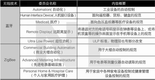 所謂下一代遙控器,以電視使用的RF遙控器為例,就是用于控制立體聲設(shè)備、手表、照明燈具、空調(diào)、門口的監(jiān)視攝像頭或警報器等家庭安全設(shè)備和醫(yī)療設(shè)備的遙控器?梢哉f,遙控器可以實現(xiàn)整個家庭的自動控制。ZigBee和藍牙兩個陣營都正在制定關(guān)于下一代遙控器的通信標(biāo)準(zhǔn)(見表4)。