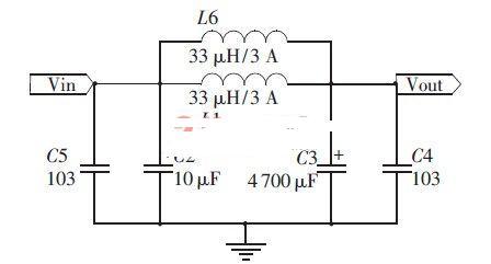 低通濾波電路采用LC濾波電路,濾波電容為4700μF電解電容和0.01μF瓷片電容,能有效減少直流的紋波和高頻干擾,兩個(gè)33μH/3A功率電感并聯(lián)可以隔離交流并提高輸出電流。截止頻率: