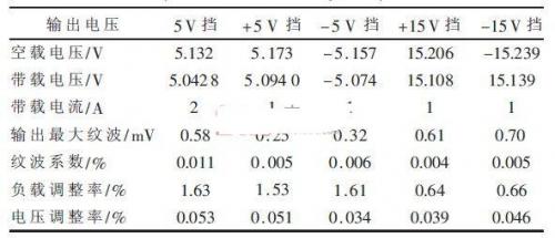 測試儀器采用固緯4位半數(shù)字萬用表(GDM-8245)、上海愛儀交流毫伏表(AS2294D)和調(diào)壓變壓器(TDGC -0.5/0.5) .負(fù)載電阻采用水泥電阻(2.5Ω/20 W、5Ω/20 W、15Ω/20 W) .電源性能參數(shù)如表1所示?梢钥闯,負(fù)載調(diào)整率和電壓調(diào)整率反映出了電源較高的穩(wěn)定度,紋波系數(shù)指標(biāo)反映出低紋波特性。