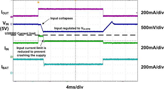 VIN-DPM 通過限制輸入電流阻止脈沖發(fā)生,從而防止輸入源崩潰。圖5 顯示了超負(fù)載USB 端口的結(jié)果。VIN-DPM 功能開始生效,降低輸入電流限制,從而防止輸入源崩潰。