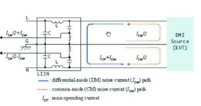 從被測物體的電流路徑來看,干擾信號回流路徑可能通過地線,或者通過其它電網(wǎng),如圖1所示。通過地線的干擾電流在電源網(wǎng)上產(chǎn)生同相位的共模干擾電壓。通過其它線在兩根電源線上產(chǎn)生反相的差模干擾電壓。干擾電流的路徑如圖2所示。