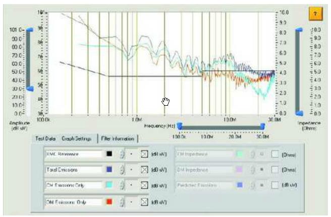 在標準電磁兼容性測試實驗室可得到設備的總干擾情況,但無法了解設備的共模干擾和差模干擾特性。為了在測量中分辨共;蛘卟钅8蓴_信號,通用的儀器是很難實現(xiàn)的。使用專用的傳導測試儀,可獲得設備的總干擾、共模干擾和差模干擾。測試結果如圖3所示。