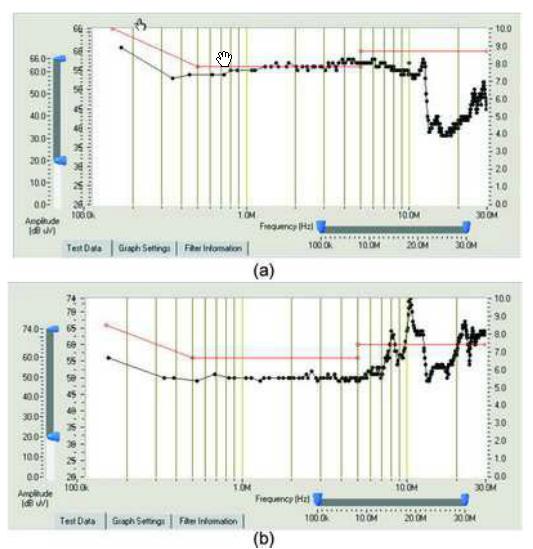 上面的例子說明,選擇一個具有很高插損的濾波器也不能很好抑制傳導噪聲的原因是,電源輸入端阻抗的影響。因此,設計者除了選擇一個合適的濾波器之外,還需要了解電源的阻抗特性、共模阻抗和差模阻抗。阻抗測試可以借助專用的阻抗測試儀或者傳導分析儀。一種濾波器的共模阻抗(a)和差模阻抗(b)的變化如圖5所示。