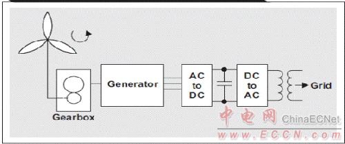老式的風(fēng)力發(fā)電機(jī)直接連接電網(wǎng),只能工作在電力線頻率下。在經(jīng)過(guò)許多作業(yè)點(diǎn)以后,它們變得很低效。新型的風(fēng)力發(fā)電機(jī)(圖1)常常把AC轉(zhuǎn)換為DC,然后再把DC轉(zhuǎn)換回AC,這樣風(fēng)力發(fā)電機(jī)便可工作在各種速度下,從而獲得最大效率。