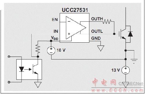 作為一種小型、非隔離式柵極驅(qū)動(dòng)器,單通道UCC27531可以很好地工作在前述環(huán)境下。它的IC輸入信號(hào)通過(guò)一個(gè)光耦合器或者數(shù)字隔離器提供。它的高電源/輸出驅(qū)動(dòng)電壓范圍為10到35V,讓其成為12V Si MOSFET應(yīng)用和IGBT/SiC FET應(yīng)用的理想選擇。這里,正柵極驅(qū)動(dòng)通常更高,并且關(guān)斷時(shí)負(fù)電壓下拉,目的是防止電源開(kāi)關(guān)受到錯(cuò)誤導(dǎo)通的損害。一般而言,SiC FET由一個(gè)相對(duì)于電源的+20/-5V柵極驅(qū)動(dòng)器驅(qū)動(dòng)。同樣,就IGBT而言,系統(tǒng)設(shè)計(jì)人員可能會(huì)使用一個(gè)+18/-13V柵極驅(qū)動(dòng),如圖3所示。