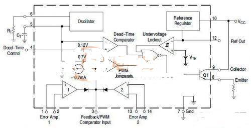 控制信號由集成電路外部輸入,一路送至死區(qū)時間比較器,一路送往誤差放大器的輸入端。死區(qū)時間比較器具有120mV的輸入補償電壓,最小輸出死區(qū)時間約等于鋸齒波周期的4%,即輸出驅(qū)動的最大占空比為96%.當把死區(qū)時間控制輸入端接上固定的電壓(范圍在0-3.3V)即能在輸出脈沖上產(chǎn)生附加的死區(qū)時間。脈沖寬度調(diào)制比較器為誤差放大器調(diào)節(jié)輸出脈寬提供了一個手段:當反饋電壓從0.5V變化到3.5V時,輸出的脈沖寬度從被死區(qū)確定的最大導通百分比時間下降到零。兩個誤差放大器具有從-0.3V到(Vcc-2.0)的共模輸入范圍,這可從電源的輸出電壓和電流察覺得到。誤差放大器的輸出端常處于高電平,它與脈沖寬度調(diào)制器的反相輸入端進行"或"運算,正是這種電路結(jié)構,放大器只需最小的輸出即可支配控制回路。