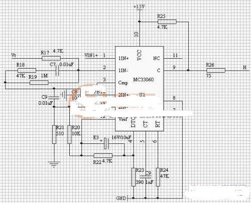 其工作原理簡述:MC33060 是一個固定頻率的脈沖寬度調(diào)制電路,內(nèi)置線性鋸齒波振蕩器,振蕩頻率可通過外部的一個電阻和一個電容進行調(diào)節(jié),其振蕩頻率如(2-1)式: