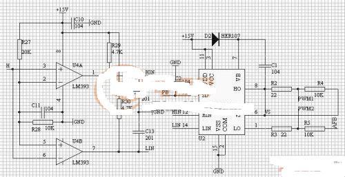 IR2110有2個輸出驅(qū)動器,其信號取自輸入信號發(fā)生器,發(fā)生器提供2 個輸出,低側(cè)的驅(qū)動信號直接取自信號發(fā)生器LO,而高側(cè)驅(qū)動信號HO 則必須通過電平轉(zhuǎn)換方能用于高側(cè)輸出驅(qū)動器。本系統(tǒng)中驅(qū)動雙管需一片IR2110 即可。