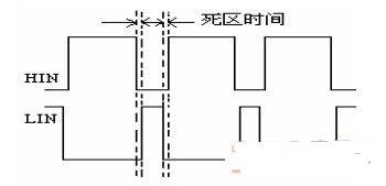 因驅(qū)動雙管,且雙管不能同時導通,控制IC 輸出只有一路信號,則在控制IC 輸出和驅(qū)動之間需加入反相延時電路,將控制IC 輸出的一路PWM 經(jīng)同相和反相比較器后,經(jīng)電阻R29 和R30 的上拉分別對電容C12、C13 充電產(chǎn)生延時,使得兩路PWM 具有對稱互補性且具有一定的死區(qū)間隔,保證主回路中兩開關管不會同時導通。在電路中HIN 和LIN 標號端得到的波形圖如下圖10 所示。
